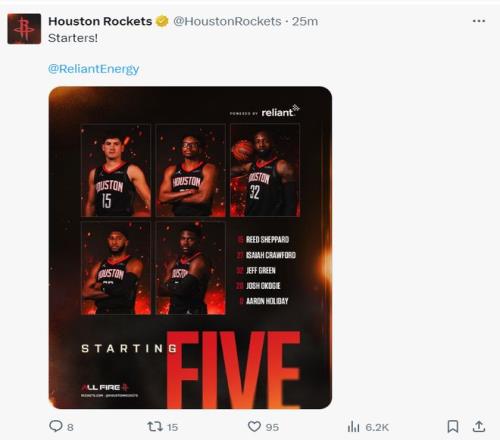 火箭:谢泼德、霍勒迪、奥科吉、格林、克劳福德;