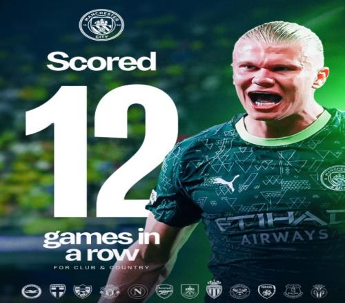 一场20,让哈兰德刷新神纪录:连续12场进球,瓜迪奥拉率队3连胜
