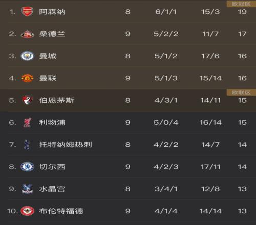 最大的意外莫过于升班马桑德兰,在本轮2-1逆转绝杀了切尔西之后,桑德兰9轮积17分已经升至积分榜第2位。“黑猫军团”有望近年来打破升班马下个赛季必降级的魔咒。而状态波动巨大的切尔西,9轮后仅积14分,跌至积分榜第8位。