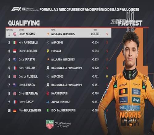 北京时间11月9日凌晨,2025赛季F1迎来巴西站排位赛的争夺。最终,诺里斯依旧延续着自己本周末的出色状态获得杆位!安东内利获得第二,勒克莱尔获得第三。皮亚斯特里表现平平获得第四,正赛从第二排起步。