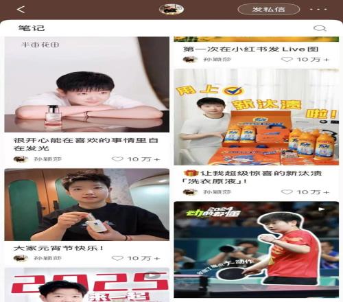 孙颖莎是乒乓球运动员中代言最多的一个。仅2025年,她在微博上发布的合作品牌有肯德基、半亩花田、理肤泉、高露洁、OPPO、一汽红旗、碧然德、OLAY、徐福记、妮维雅、梅森马吉拉香氛、美团、维达、全棉时代、脆生生薯条、李宁、多芬、香飘飘、KitKat奇巧、Keep、breo倍轻松、YAYA鸭鸭,平均每季度新增3个合作。