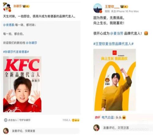 在一众合作中,非体育领域的代言占比鲜明,涵盖了普通人生活的方方面面。值得一提的是,在肯德基官宣孙颖莎为品牌代言人后,麦当劳迅速跟进签下王楚钦,体坛最受关注的“莎头CP”引发了麦肯大战。这也是一场被调侃为史上最阴险的商战,因为粉丝不知道这顿到底该点肯德基还是麦当劳,最终受伤的只有体重和德克士。