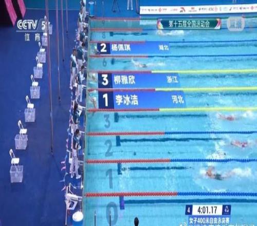 11月10日,全运会游泳女子400米自由泳:河北选手李冰洁夺得金牌,成绩为4:01.17,杨佩琪4:01.90收获银牌,柳雅欣4:03.