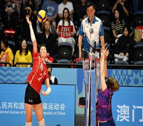 11月10日,河南队球员朱婷(左)在比赛中进攻。当日,在澳门举行的第十五届全运会女子排球成年组小组赛A组比赛中,河南队3比0战胜四川队。新华社记者 陈斌 摄