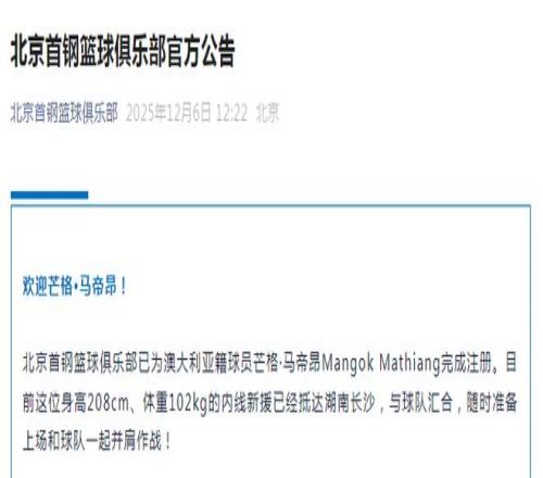 北京男篮官方公告表示:北京首钢篮球俱乐部已为澳大利亚籍球员马帝昂完成注册。目前这位身高208cm、体重102kg的内线新援已经抵达湖南长沙,与球队会合,随时准备上场和球队一起并肩作战!
