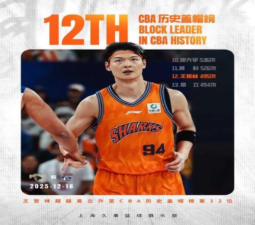 另外,在第二节比赛中,王哲林送出个人第2次盖帽后,CBA生涯盖帽总数上升至495次,超越易立的494次,升至CBA历史盖帽榜第12位!